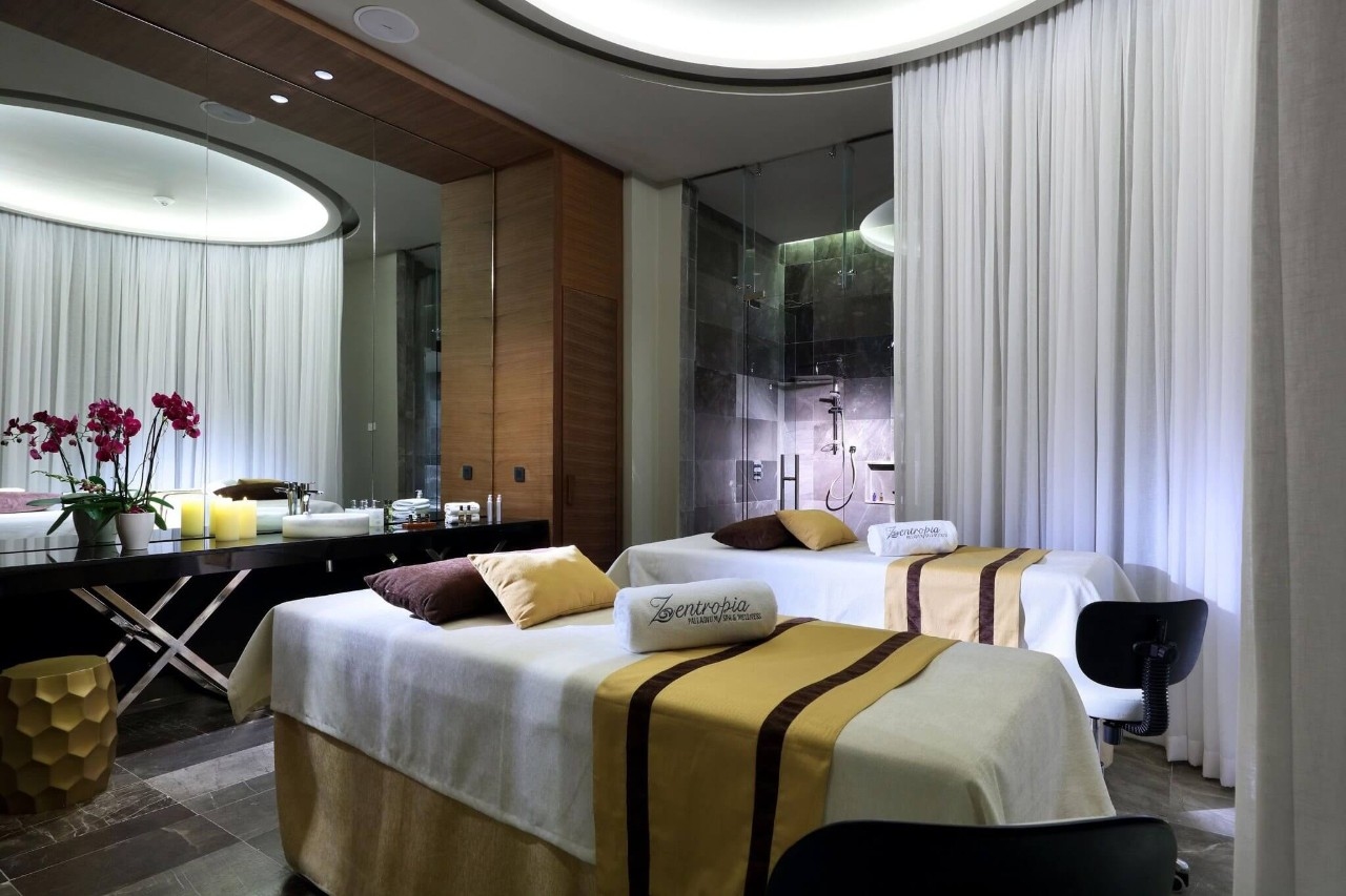 Grand Palladium Select Costa Mujeres Resort & Spa is a 5-star, family-friendly, all-inclusive beachfront resort located between Cancún and Isla Blanca, along the turquoise waters of the Mexican Caribbean. Guests enjoy access to 7 à la carte restaurants, 19 bars (including a 24-hour option), a pizzeria, café, and Italian ice cream shop. Accommodations include junior suites and loft-style suites with hydro-massage tubs, furnished balconies or terraces, and options like swim-up access or two-story layouts. The resort offers endless activities, including live music, fitness classes, water sports, dance lessons, and daily entertainment. Children can enjoy the Baby Club (ages 1–3), while adults unwind at the Zentropia Palladium Spa & Wellness (4,800+ m²) featuring a hydrotherapy circuit, Himalayan salt room, snow room, and more (additional charge). Guests can also take advantage of the Rafa Nadal Tennis Center, with 8 courts, a padel court, and a museum with café. A day pass to sister resorts in Riviera Maya is included with Absolute Indulgence.